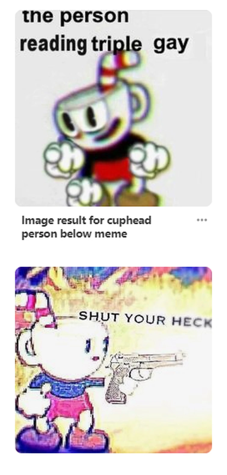 The person below triple. Find the newest Person Below Triple Gay meme. Triple Gay refers to an image macro of Cuphead from the Cuphead video game pointing downwards with the caption The person below triple gay implying that in a social media feed the person whose post is below the Cuphead image macro is triple gay. This thread is archived.